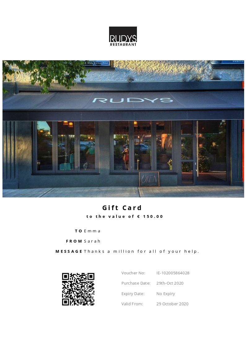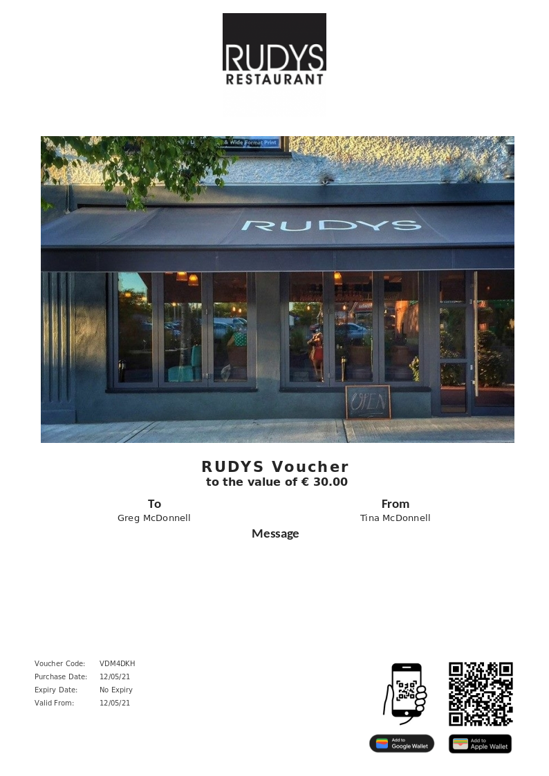 RUDYS allows you to purchase instantly printable gift vouchers, special offers and tickets using the Voucher Connect platform.